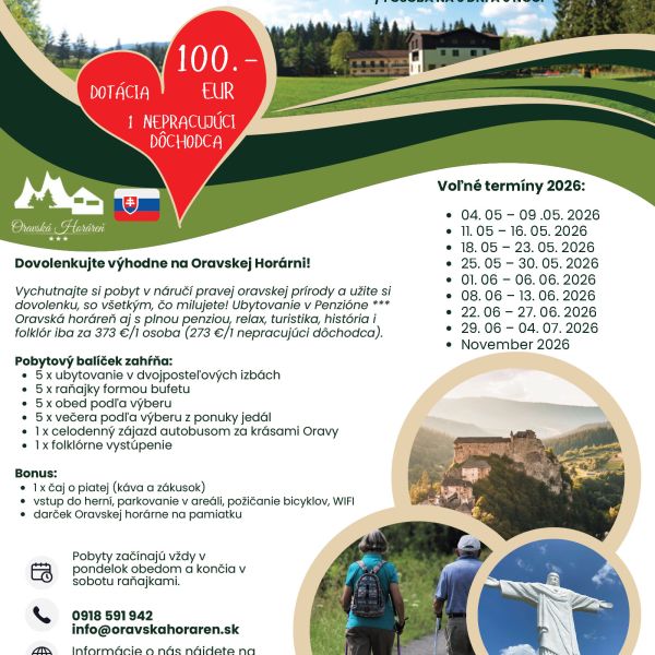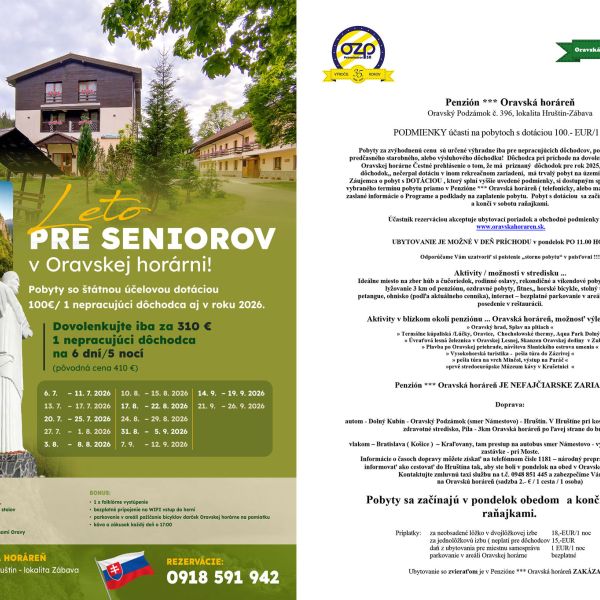Akcie Jar 2026Leto pre seniorov 2026Veľkonočný pobyt 2026Pohodové Jarné prázdninySankovačka-Lyžovačka pre OZP 2026Oravská jar 2026Štedré Vianoce OH 2026Dôležité informácie pre seniorovObchodné podmienky OH 2025Certifikát kvality 2024 - MegaubytovanieDarčekový pokaz